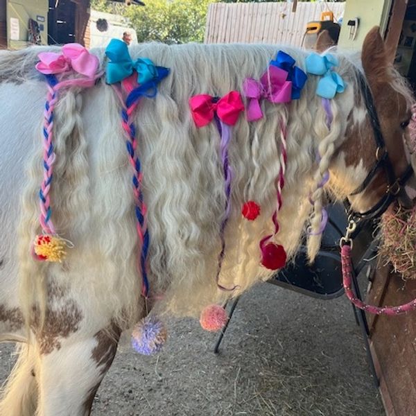 Pony ride for each child followed by a grooming/decorating total time at the party 1.5 hours. Each child shall get a pony party rosette and the birthday girl/boy shall get a birthday rosette £300.